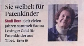 Berner Zeitung, 29. November 2019 – Stefan Schnyder Stadt Bern Samra Losinger sammelt seit über 50 Jahren Geld für Kinder aus Tibet. Am besten laufen die Kinderpatenschaften. Auch wenn es Kritik daran gibt, will sie an diesen festhalten Tibet...