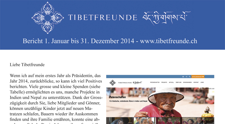 Intern arbeiteten wir daran, Schritt mit den neuen Medien zu halten. Im Frühjahr können Sie unsere neue Web- site auch auf Ihrem Smartphone oder Ihrem Tablet anklicken. Dann kann eine Patenschaft direkt ausgewählt und via Antragsformular an uns weiter geleitet werden, ebenso die Mitgliedschaft. Mit den Spendenknöpfen ist Ihre Spende gleich am richtigen Ort. Auch haben wir die Arbeit im Vorstand strukturiert. Um unsere Arbeit optimaler bewältigen zu können, ist die Suche nach engagierten Männern und Frauen eine dringende Aufgabe. Daher mein Aufruf an Sie, liebe Tibetfreunde: Wenn Sie etwas Zeit zur Verfügung haben, so melden Sie sich doch. Wir sind jedoch guten Mutes, dass wir mit Ihrer Treue und Freundschaft auch im Jahr 2015 wieder viel Positives bewirken können.