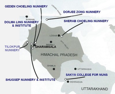 About 600 nuns currently live in six different nunneries centred on Dharamsala. They are the Geden Choeling (139 nuns, Gelugpa tradition), Tilokpur (65 nuns, Kagyu tradition), Dolma Ling (238 nuns, of all traditions), Shugsep (58 nuns, Nyingma tradition), Sakya nunnery in Dehra Dun (51 nuns Sakya tradition) and the Sherab Choeling (45 nuns, all traditions)